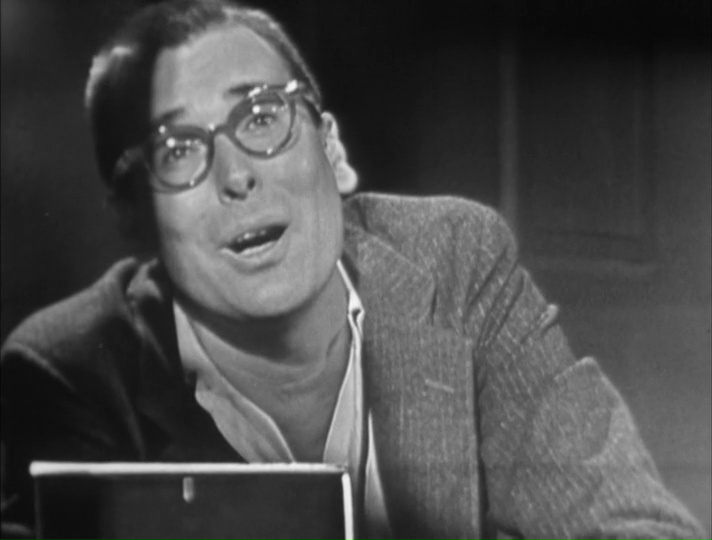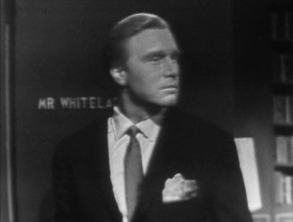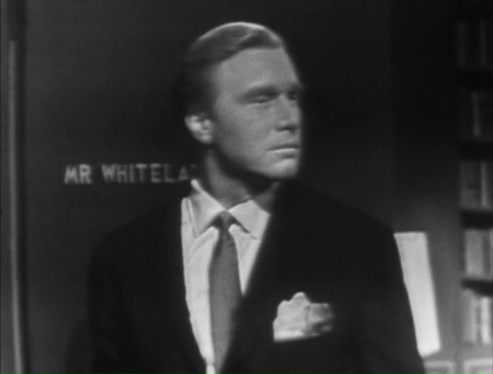 Broadway luminary Janet Blair is outstanding as the titular “Venus” (–she, whom Whitelaw refers to as “The most beautiful woman ever conceived in the mind of man!”) Blair’s take is equal parts impishness and seductress—and her captivating grin seems to have been made for a television close-up! Gifted with a majestic voice that’s a fine fit for the soaring musical anthems and airs with which she’s been tasked, she validates this straight away with the alluring “I’m A Stranger Here Myself”—arguably the most acclaimed of the scores’ inclusions. She also superbly holds up her end of several duets, (“Speak Low” and “Foolish Heart” among them;) but she especially enthralls late in proceedings with the blithesome “That’s Him” (“Wonderful world—wonderful you!” she rejoices after finally triggering “Rodney’s” devotion.) As the clean-cut, bespectacled (–if often befuddled,) object of her ‘obsession’, Russell Nype is “Rodney Hatch”. Himself no stranger to the “Great White Way” (–he won a “Tony Award” for his role opposite Ethel Merman in the premiere production of “Call Me Madam”,) Nype too, possesses an impressive voice which he puts to terrific use in “Rodney’s” preliminary—and verbally dexterous—outing, “That’s How Much I Love You” (sung to his Fiancée of five-years, “Gloria’s” framed picture no less!) He’s also a knockout holding up his end of the lush duet, “Speak Low”—bestowing some top-notch harmony opposite Ms. Blair, as our boy finally begins to succumb to the Goddess’s charms. Later, “Waiting For Our Wooden Wedding” is enthusiastically conveyed as he dreams of those idyllic days when he and his ‘domesticized’ Goddess are “and old married couple (“—like Blondie and Dagwood!” he gushes.) Meanwhile, George Gaynes—today best remembered for his comedic roles in “Punky Brewster” and the “Police Academy” films, exhibits a ‘suave’ (–if also sleazier–) side to his younger personality as “Whitelaw Savory”. In this, ostensibly the “Villain” role, Gaynes reveals a robust song-styling capability as well as a distinctive finesse for the score’s numerous poetic lyrics, making his ‘First Act’ solo “Westwind” one of the most satisfying of the entire telecast. Then, when “Venus” saves him the trouble of having to leave his penthouse office by suddenly appearing at his door, it leads into “Foolish Heart”–another A-Plus duet between the two, wherein they commiserate over their mutual conundrum: He longs for her, (his ‘girl that got away’) while she pines for “Hatch”, as together they sing, “Poor foolish heart! Crying for one who ignores you! Poor foolish heart–flying from one who adores you!”
