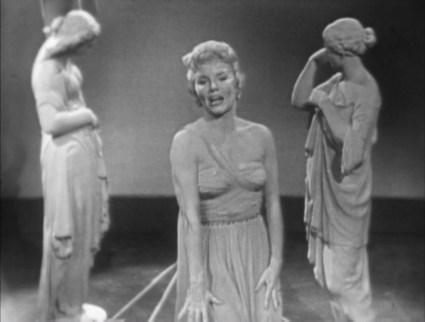 “You see here before you a woman with a mission–I must discover the key to his ignition! (And if he should make a ‘diplomatic proposition’–how could I possibly refuse–when I’m a stranger here myself?)” Janet Blair is a Goddess on a mission searching out romance as “Venus” in “One Touch Of Venus” now available on DVD from “Video Artists International”.