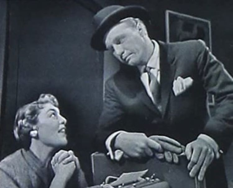 Co-Starring as “Molly Grant”–Savory’s never at a loss for the perfect wise-crack Girl-Friday, Laurel Shelby is downright unforgettable–over and above being supremely skilled with a throw-away pun or gag-line. When her boss’s suspicion is peaked over the idea that ‘a nobody of a barber’ like Hatch might be harboring his precious—and very missing–sculpture, in the true manner of many a pulp-novel, Savory makes plans to visit the shop for a surreptitious look-around. “Listen Bub!” Molly warns him; “You’re an eccentric millionaire—not Sam Spade!” Subsequently at the launch of “Act Two”, She gives a breezy (if slightly abbreviated for time purposes,) rendition of the title tune, “One Touch Of Venus” while rhythmically tapping away at her archaic 50’s era typewriter. Monte Marshall too, is a standout as Savory’s ‘Shabby Bloodhound’, “Julius ‘Taxi’ Black”—a would-be ‘Private Eye” who also seems content to do most of the tycoon’s dirty work as long as the price is right. When caught’ looking into a stopped-up sink in “Hatch’s” shop (–which “Taxi” purposely blocked-up in an attempt to distract the barber,) he’s asked “Are you a plumber?” to which this goon-for-hire dismissively counters, “I’ve been working with ‘drips’ all my life!”