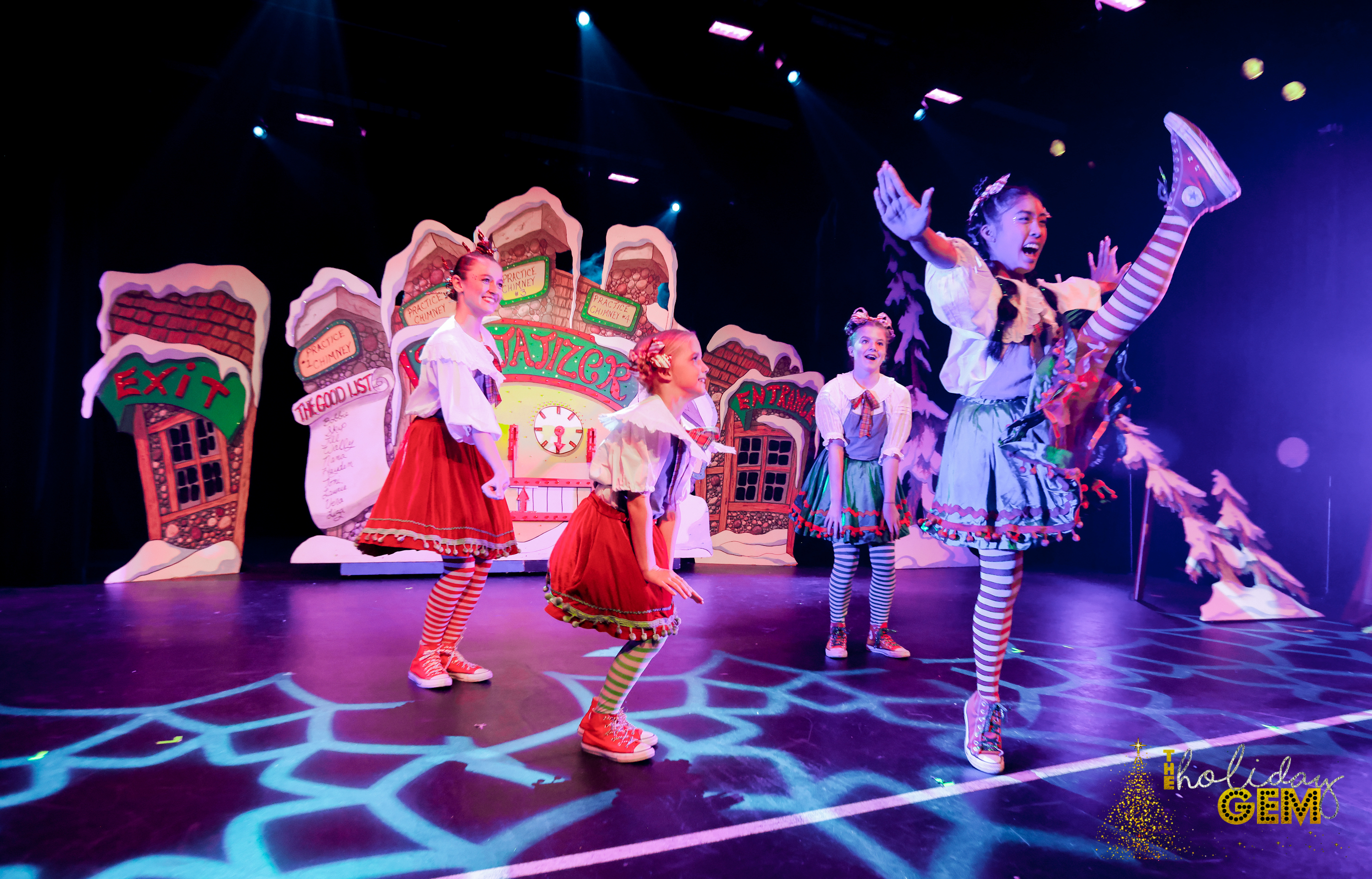 “Climb down the chimney; put up the brightest string of lights I’ve ever seen! Slice up the fruitcake–it’s time we hung some tinsel on that evergreen bough! We need a little Christmas now!” The “Workshop Elves”: Sydney Sublette, Bryn Sparkle Reid, Greer Smith and Jordan Seto, celebrate having the best job in the world in One More Productions’ 2021 Edition Of “The Holiday GEM”
