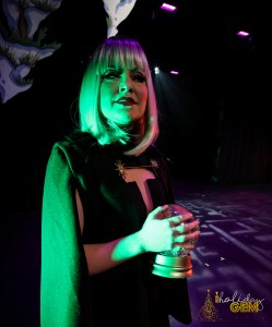 “I put a Spell on you! Because you’re mine! You’d better stop the things you do, I tell you: I Ain’t Lyin’!” Hannah Clair as “Cicely Frost” isn’t above using any power at her disposal to gain control of Santa’s magic snow-globe in One More Productions’ 2021 Edition Of “The Holiday GEM”