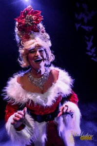 As the focal point for all the hub-bub, “Mrs. Claus” (AKA “Agatha Frost”) pretty much drives most of the on-stage intrigues. As “Mrs. Claus”, Adriana Sanchez can very probably claim that she’s developed something of a following with her role throughout the show’s many incarnations –painting her as a comical mix of JoAnne Worley, Phyllis Diller and Marge Simpson, while managing to make all their qualities uniquely her own. Even better is that it allows her to make the most of both her venerable singing talent AND her expert comedic abilities. She particularly shines leading the group in “It’s Today”, immediately followed by “We Need A Little Christmas” –both from the iconic musical “Mame” (and each give the unfolding escapades a jovial boost toward the end of Act One.) As her ‘sister’ “Cicely Frost”, Hannah Clair also does a knock-out job in the “Villainess” role, keeping with the frequently raucous-but-heartfelt tone of the overall program, while on no account being “too cautious” about going a little ‘over-the-top’ with her portrayal; but then, “Cicely” is, at her core, a narcissistic (–albeit ‘faded’) Diva with designs on world, or at least Holiday, domination. Just as impressive is learning that Ms. Clair stepped into the role near the last minute! She too, has an accomplished way with conveying a song as she does with “I Put A Spell On You”, wherein the evil “Ms. Frost” is bathed in shocking green lights as she ‘enchants” ol’ “Père Noël” and his band of “Workshop Elves”. Before the conclusion of our tale, she comparably demonstrates a pleasant sensitivity with her 11 O’ Clock charmer, “A Change In Me” (from Disney’s hit stage-adaptation of “Beauty And The Beast”.) Every bit as pleasing too, is “Cicely” and “Mrs. Claus’s” duet of the quintessential festive-season standard, “Jingle Bells”, here staged as both a comic battle of one-upmanship–and a side-splitting homage to Barbra Streisand’s…uh…distinct recording of that song.