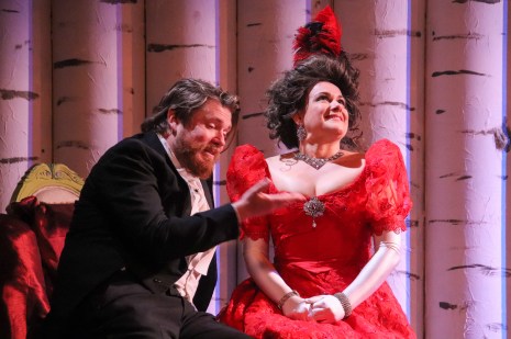 “Men! Look at you—a man at an age when a woman is lucky if a drunken alderman pinches her derriere at a village fete! And yet, you have managed to acquire the youngest, prettiest…I hate you being happy—I hate anyone being happy!” Peyton Crim (Left) as “Fredrick Egerman” commiserates with Sarah Wolter (Right) as “Countess Charlotte Malcolm over a disastrous weekend for them both In “The Greenway Court Theatre’s” 2022 Production of “A Little Night Music”