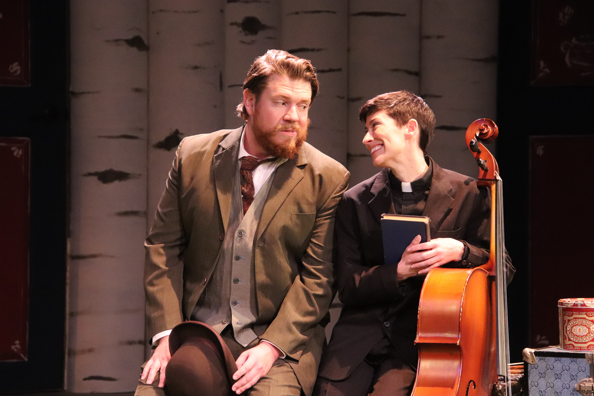 Another ‘challenge’ to cross-gender/“non-binary” casting is that those portraying a different-gendered character don’t always meet the requirements of the role—physically or emotionally. This frustratingly, is the case with several of the dramatis-personae presented. Take for example Amanda Kruger who makes for a too-petite “Henrik Egerman”. Yes, Kruger plays a boy very effectively–however, given such a diminutive stature and innate delicacy, “Henrik” comes off as more of a pre-pubescent one and simply too young. This jeopardizes the plausibility that “he” (–written as a repressed 19-year-old seminary student who brashly desires to be “a part of God’s Army”,) is experiencing inner, hormone-fueled turmoil, while secretly battling his stifled attraction to his teenaged stepmother. This also makes the later scenes of his and “Anne’s” romantic ‘discovery’ of each other …well, frankly a bit hard to watch. Kruger also lacks the needed passion and fury the portrayal requires This is, all things considered, a lad who finds misery and contempt in nearly everything, only taking joy in his ‘profound” cello playing. (At one point Henrik’s father observes of his ‘son’: “I’m afraid being young in itself is a trifle ridiculous; good has to be so good, bad so bad; such superlatives!”) Inasmuch as “Henrik” is supposed to be a steadfastly gloomy, dour presence lowering over much of the intrigues, what we get in its place is a “Presence-Lite”.