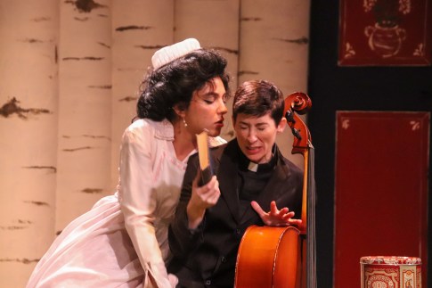 “You smell of soap…do those old teachers take a scrub-brush to you every morning and scrub you down like an old ‘dray-horse? (Oh, what a wicked woman I am! I’ll go straight to Hell!)” Alexa Rosengaus as “Petra” the maid, seeks to be denounced as ‘fallen woman’ by Amanda Kruger as Divinity student “Henrik Egerman” In “The Greenway Court Theatre’s” 2022 Production of “A Little Night Music”