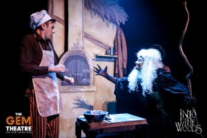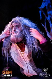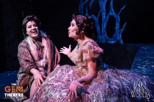 Lighting Designer, Jon Hyrkas makes laudable use of the new State-of-the Art digital lighting that the theater has recently acquired and the production flourishes all the more for it. Over and above bathing the on-stage happenings in a plethora of fresh colors and shades, he’s been able to interject several cutting-edge lighting effects as well. To enhance the overall ‘murkiness’ of the woods, he judiciously employs some awesome ‘horror-movie’ back lighting here and there with tremendous success, such as in the midst of “I Know Things Now”, when “Red Ridinghood” recounts the surreal nightmare of being swallowed alive along with her “Granny”, by the wolf. He also makes inspired use of ‘up lighting’ (placing the lighting element low where it can cascade ‘up’, casting otherworldly shadows from exotic angles, hence adding the intrinsic ‘feel’ of the stage being one large “Story Book” illustration. Yet by far his most spectacular achievement is the incredible specialized lighting/projection effect he’s created to accompany each of the encroaching Giantess’s thunderous “footsteps” which are seen and viscerally ‘felt’ all through the Gem’s auditorium. (Give this one a giant WOW!) Make-up designer Brian Bolanos has comparably concocted some dynamic special make-up effects—especially for the Witch and the Wolf! He even manages to gracefully finesse one of the libretto’s trickier requirements: Once the curse is ‘reversed’ the Witch instantly becomes pretty again, but (to her dismay) powerless. This on-stage ‘transformation’ is achieved cleverly and effortlessly right before our eyes, just prior to the big act break, “Ever After”.