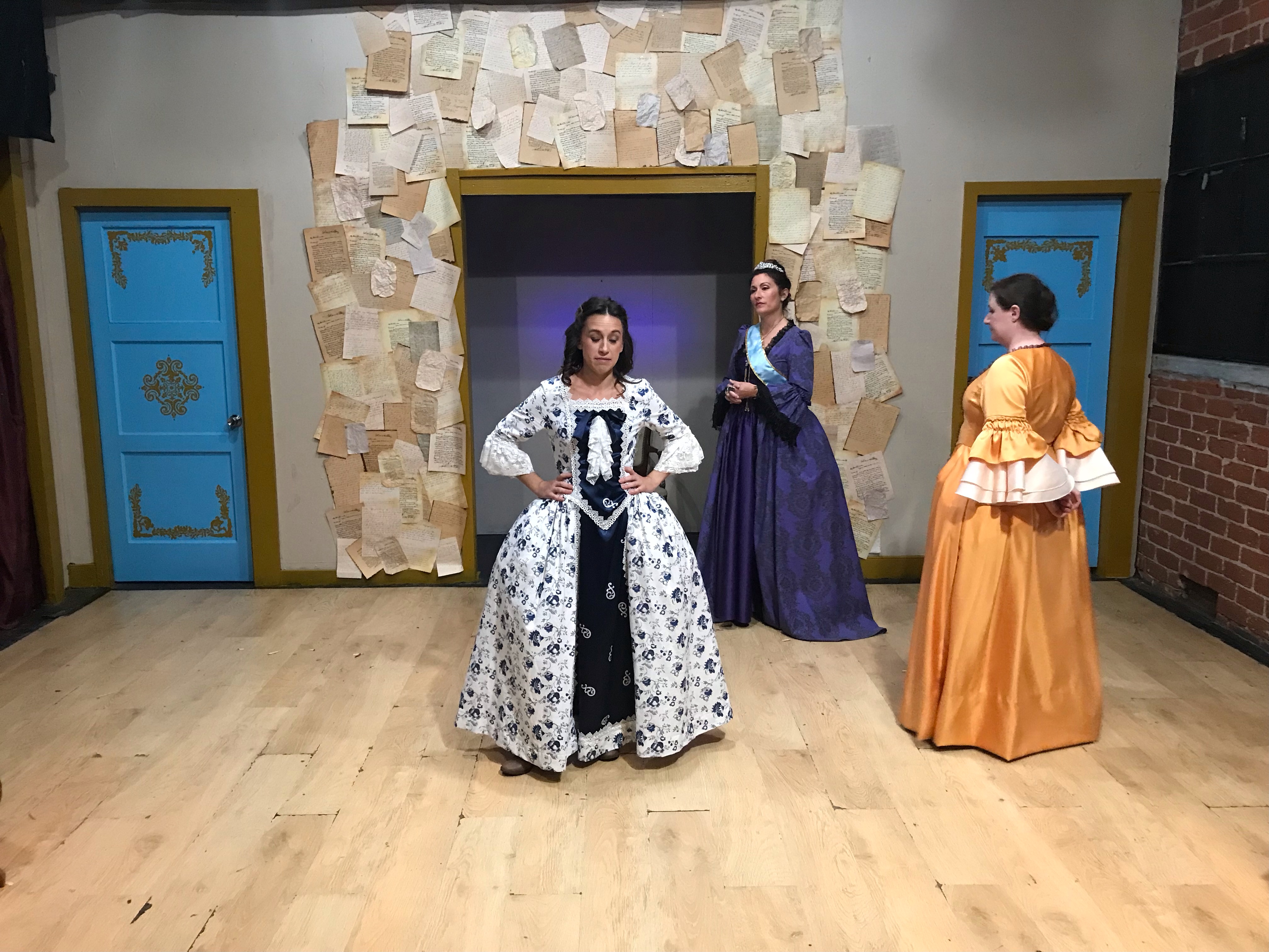 “Since there’s not much we can do about your ‘looks’, have you done as I instructed and conduct yourself in a dainty way? Have you never interrupted, and agreed with everything he had to say? Maybe you didn’t do it right—it takes a womanly insight!” Jessica Reiner-Harris (Left) as “Princess Joanna Elisabeth of Holstein-Gottorp” educates Elise Walters as her daughter, “Princess Sophie Of Anhalt-Zerbst” (later “Catherine The Great”) in the proper way to entice a husband who is to be the next Tsar of Russia the 2022 World Premiere production of “The Path To Catherine” at “The Brickhouse Theater” in North Hollywood.