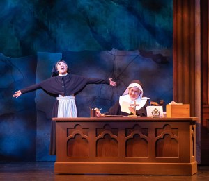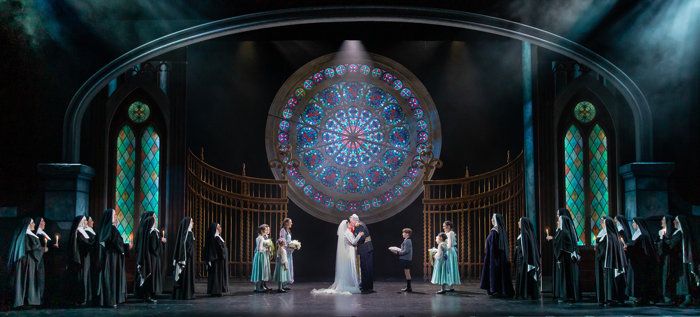 Not to be overlooked either is the Musical Direction by Dennis Castellano, who keeps the goings-on galloping to a full-on brisk polka-sized cadence! “How Do You Solve A Problem like Maria”—performed as a quartet between “Sisters” Berthe, Margaretta, Sophia and “The Reverend Mother”, vivaciously launches the story while setting up one of the basic conundrums that will drive the plot. The positively magnificent—even ‘Angelic’ harmony heard in the nun’s “Praeludium’ at the very start of the show is bound to leave you breathless—and that’s only ONE example of the exceptional chorale work this production can boast. Later they collectively astonish and amaze with their “Gadeamus Domino” chorus which is quickly followed by “Confitemini Domino” leading into the wedding of “Maria” and “Captain Von Trapp”. Indeed, these sections are so impressive and intricate to the show’s success, this “Nun Choir” had its own “Casting Coordinator”, Lindsay Brooks. But then, to the show’s vast credit, ALL of the ‘featured’ Nuns exhilaratingly have distinct—and developed—individual personalities too. The score also affords a number of incomparable “powerhouse” duets, trios, and quartets, among them “My Favorite Things”—herein set in the confines of the “Mother Abbess’ ” office and shared betwixt her and her recalcitrant ‘Postulant” “Maria”. Transforming the stanzas into a kind of sung ‘game’ the two are sharing, the elder “Abbess” can’t help herself but to get caught up in it’s jovial sentiments herself –the result is a major crowd-pleaser early on. Later, at the show’s conclusion the nun’s come together again—“raising their voices up to the heavens” in a gorgeous group rendition of “Climb Every Mountain” while behind them, we see the Von Trapp family doing just that—ascending the mountain well on their way to freedom and safety. (Yes, you can bet–it’s every bit as inspiring as you might remember it.)