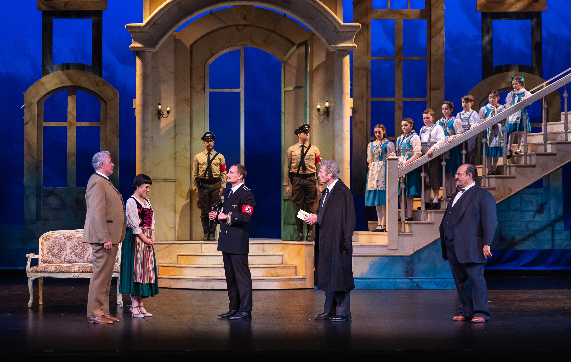 “There’s going to be an Anschluss! I warn you and everyone like you—and that goes for our host!” (Front Row -Left to Right) Christopher Carl as “Captain Von Trapp” with Diane Phelan as his newly wedded wife “Maria”, are confronted by Adam Lendermon as “Admiral Von Schreiber” and Gordon Goodman as “Herr Zeller” regarding the Third Reich’s plans as Roland Ponce Rusinek as “Max Detweiller” and the Von Trapp children helplessly watch in “The La Mirada Theatre For The Performing Arts” & “McCoy-Rigby Entertainment’s” 2022 Production Of Rodgers & Hammerstein’s “The Sound Of Music”