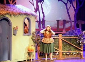 The original Broadway production set a new technical standard regarding the innovations it spawned back in 2013. As it happens, several new clothing effects concerning quick changes on-stage were literally ‘invented’ for it, which are put to striking use here. (Little wonder the show handily won the Tony for “Best Costume Design” that same year!) For “The Morgan-Wixson’s” current offering, Anne Gesling’s Costume Designs are as substantial as they are vibrant. What’s more, it’s also no exaggeration to say that these are the best costumes of any local production you’re likely to see this year! From “Charlotte’s” contrasting Pink, and Gabrielle’s Orange and Green, frocks to “Marie’s” drab red-velvet overcoat (before she ‘miraculously’ transforms from it into a stunning baby-blue lace gown,) each of her clothing selections are always spot-on and quite often dazzling. Such is also the case with the slippers “Cinderella” sports, now made of Venetian glass—rare in the Middle Ages, but highly prized. For the finale, she has the entire cast clad in stately white silk finery save for Cinderella and the Prince who sport matching gold outfits which elegantly contrast everyone around them. Moreover, Scenic Designer Bill Wilday (who also provided the Lighting Design) has also performed his own kind of scenic prestidigitation, favoring a number of pseudo ‘cut-out” sets which are just as colorful as the costumes, and reminiscent of illustrations you might find in a child’s storybook. (Consider for example, the “Kitchen Set” of Cinderella’s cottage—pink with purple doors, while on the outside the ‘house’ is turquoise with an amber thatched roof.) Meanwhile, the illusion of the carriage “driving off” to the prince’s castle is inventively achieved with marvelous effectiveness by means of animation projected on to the back scrim.