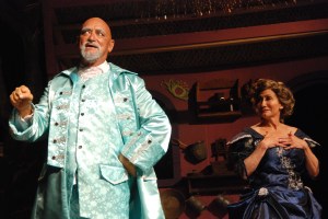As the titular protagonist “Cinderella”, Katelyn Coon exhibits a nice “girl-next-door” sort of charisma. Hers is a giddy, ebullient–yet down to earth, take on this classic fairytale figure, and her approach in turn, easily has us rooting for her at every turn. Gifted with a sweet, mellow lilt to her voice, she makes “In My Own Little Corner” nothing short of lovely to hear. After intermission, her soliloquy (another new addition for this version) titled “He Was Tall” has Cinderella trying to recall and process everything the evening has entailed and all her wonderful feelings inherent to it. It’s an irrepressibly pleasing–even somewhat poignant, moment and one of many that is impeccably conveyed by Ms. Coon. Co-starring as her “Fairy Godmother” (A.K.A “Crazy Marie”) is Julie Hinton. “That is merely ‘Crazy Marie’,” Cinderella describes her upon their sudden precursory meeting with “Prince Topher”; “she lives in the woods and only comes to town to gather what others throw-away. She is gentle in every way—sweet and delicate, but…well, ‘you know’.” Ms. Hinton also proves to be a bona-fide vocal powerhouse as she demonstrates in her duet with Coon, “Impossible/It’s Possible” as Cinderella prepares to go to the ball. It’s an A-Plus endeavor, with the added bonus being that its also loaded with plenty of dynamic special costume effects that sees both of them ‘transforming’ from wearing dusty rags into opulent gowns right before our eyes! Toward the play’s climax, she is granted another opportunity to amaze us all over again —which she most certainly does, with “There Is Music In You”. Originally written for the movie “Mainstreet To Broadway” in 1953, the song was incorporated into the score for “Cinderella’s” 1995 TV incarnation (expressly for Whitney Houston who played “The Fairy Godmother”.) Happily, Carter-Beane and company chose to keep it in for their 2013 stage re-envisioning where it remains a remarkably fitting anthem for the “Godmother’s” role. Placed late in the second act, Ms. Hinton’s powerful rendition is definitely worth waiting for!