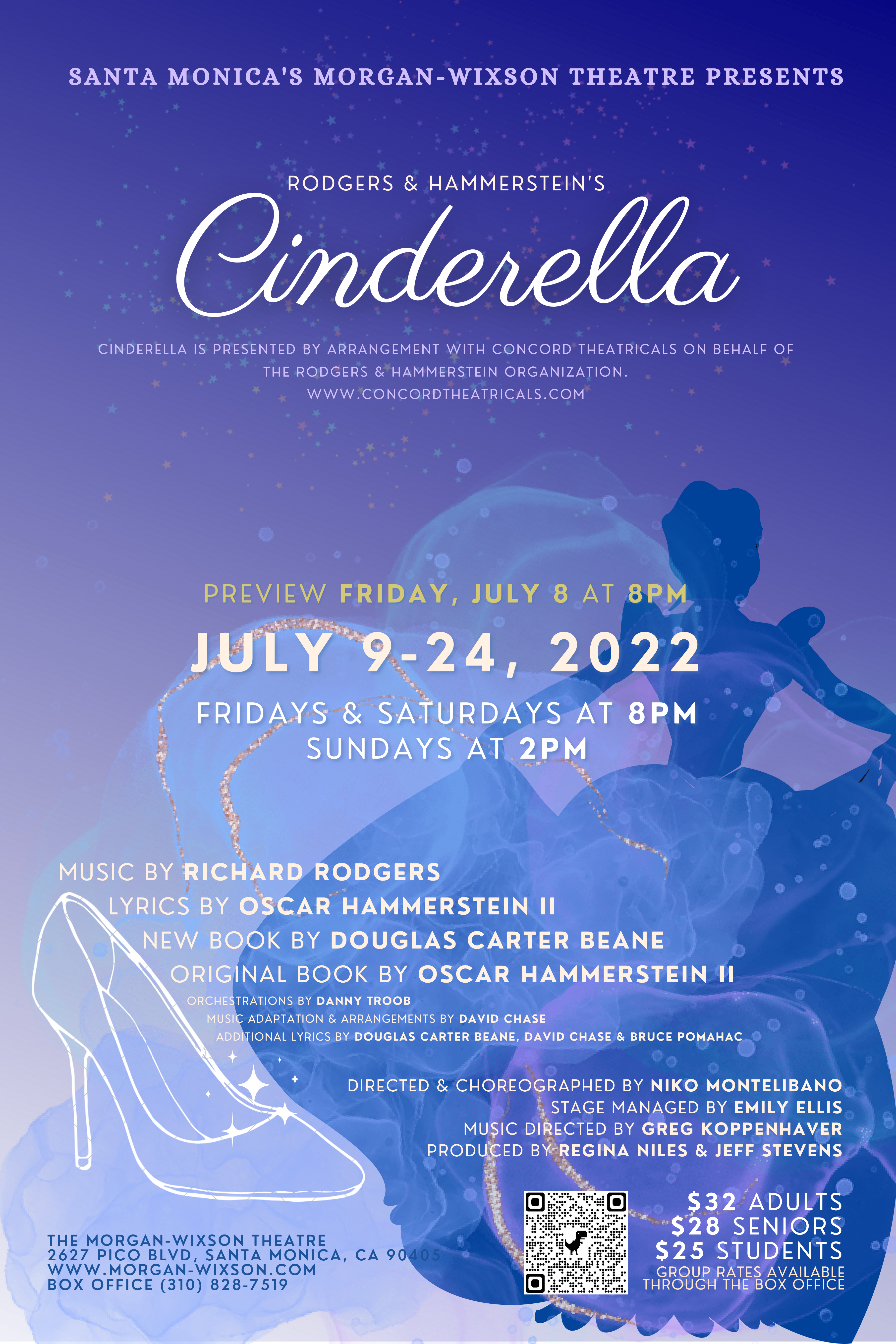 orget any “Folderol and Fiddle-Dee-Dee”: ‘Once upon a time’ is now as the landmark “Morgan Wixson Theatre” in Santa Monica California proudly celebrates their 75th anniversary season—and their return to presenting fully staged musicals, with “Rodgers & Hammerstein’s Cinderella”! Featuring music by Richard Rodgers and lyrics by Oscar Hammerstein II, (with additional lyrics by Douglas Carter Beane, David Chase, and Bruce Pomahac,) this version also employs a new book by Douglas Carter Beane (based on the original by Oscar Hammerstein II.) Nominated for nine “Tony Awards” and earning three “Drama Desk Awards”, this new reimagining of the beloved romantic fable brilliantly combines the classic story with a few contemporary ‘twists’ as only Douglas Carter Beane could do it. Direction and Choreography for this new production is by Niko Montelibano, while the Musical Direction is provided by Greg Coppenhaver, with the sum total of their efforts resulting in a thoroughly enchanting time at the theater for audiences of ALL ages, that’s always engaging, completely likable, and sometimes even a bit magical to see!