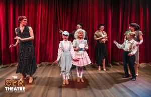 To see this particular show at this landmark theater, which celebrates its centennial next year–and itself is said to have been a real burlesque theater “back in the day” (before being converted to a movie theater in the 30’s,) gives the production an added resonance and vivacity. Add to it how over the last year, “The Gem” has been extensively re-modeled to reflect its earlier “Art Deco” style of its incipient years, and it’s no exaggeration to assert that one may even feel a strange sense of glories past from seeing this production. Director Lorton even employs two sultry peroxide-blonde “card girls” (played by Gio Martinez and Iva Erwin) to slink onto the stage between scenes and change the title cards which inform us where the next scene is occurring, (as was the practice in old Vaudeville.) After intermission, they change places with two card boys (Reid Harris and Matthew Rangel.) To top it off, on opening night Lorton made known that “Gypsy” was the very first show he ever directed back in the early 2000’s. Hailed as a “Musical Fable Of Showbusiness” the show is based on the 1957 memoirs of Gypsy Rose Lee (one of the most famous ‘Burlesque” performers of the 20th century.) The story opens in her childhood with her (then billed by her real name, “Louise”) and her sister “Baby June” trying to make a name for themselves in Vaudeville. Trouble is, their overbearing and demanding “Never take no for an answer” mother, “Rose” is as much of a hindrance as a help to them. Determined her kids (or, well, ‘June’ anyway,) has stardom in their future, she stops at nothing to make sure that will happen–even if it means eventually putting her ‘other’ daughter “Louise” on the Burlesque stage (once the children grow beyond ‘Kiddie Talent Shows’ and ‘June” runs off to ‘escape’ her mother’s fanatical influence.) There, plain-Jane, underconfident “Louise” quickly finds her voice and rises to become the re nowned (and in some circles infamous) “Gypsy Rose Lee”. (Bear in mind though, as is accurately represented here, “Gypsy Rose Lee” never really stripped fully–always leaving much strategically covered, making her act, by today’s standards, more ribald than anything truly revealing.)