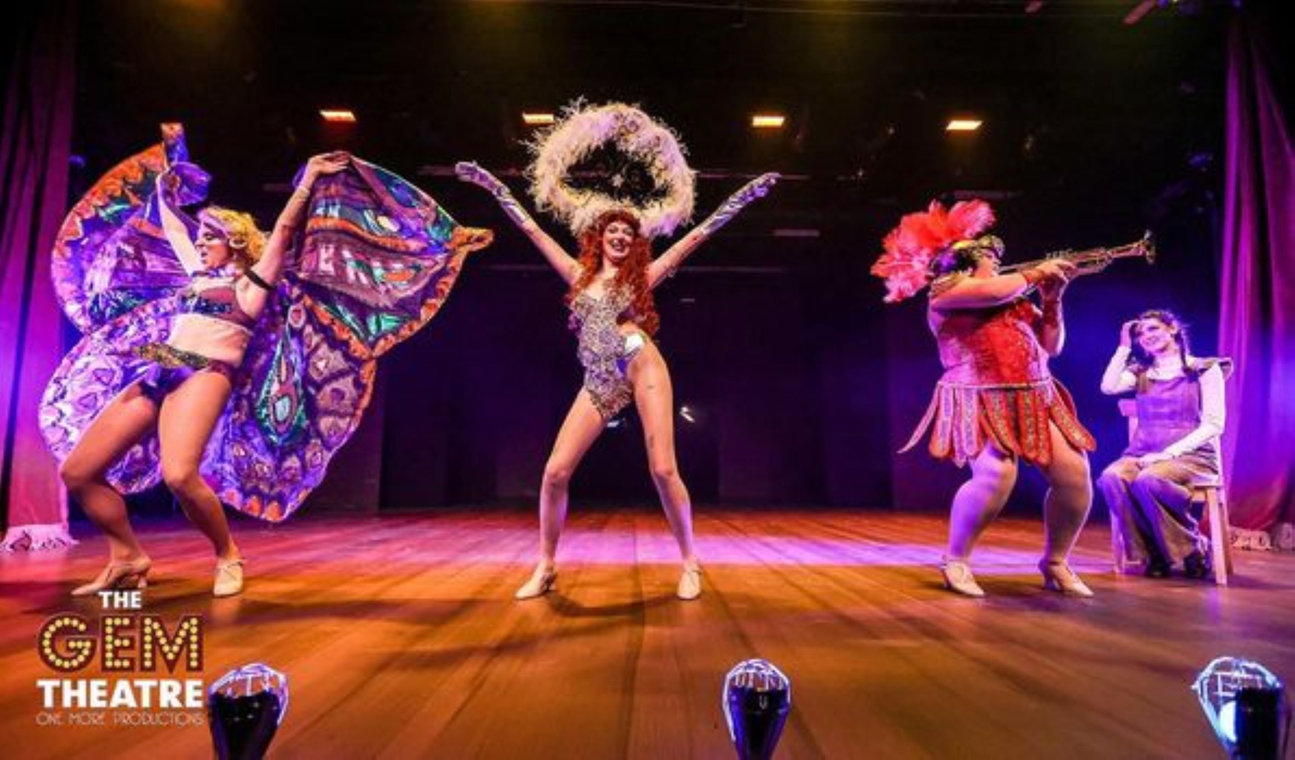“You can sacrifice your Sacro working in the back row. Bump in a dump till you’re dead. Kid, you gotta have a gimmick if you wanna get ahead…”. Julia Iacopetti (Left) is “Tessie Tura”, ’Cassidy Love (Center) as “Electra” and Alexandra Kyte (Right) as “Miss Mazeppa” show Courtney Hays (Seated Right) as “Louise” that to be successful in Burlesque, “You Gotta Get A Gimmick”” In One More Productions’ 2022 Staging of “Gypsy”