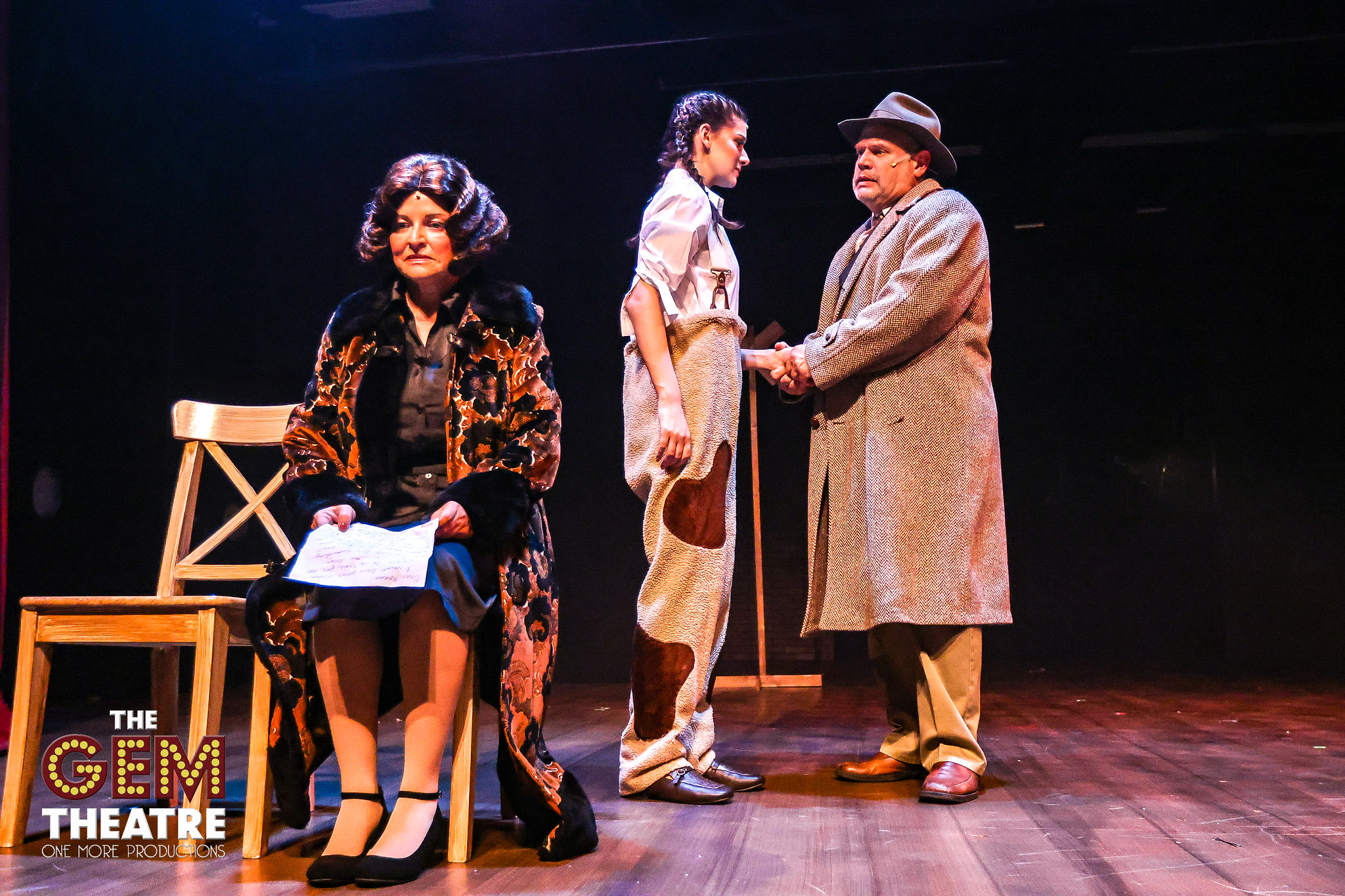 “I’m used to people walkin’ out. When my own mother did it I cried for a week; and then your father did it—and the man I married after him did it, and now…well, this time I’m not cryin’—I’m apologizin’—to you! I pushed you aside for her! I made everything just for her…” Adriana Sanchez (Left) as a devastated “Mama Rose”, plans an even bigger come-back this time for Courtney Hays as daughter “Louise” (Center) who, along with Jon Michell (Right) as Manager “Herbie” each listen in stunned disbelief in One More Productions’ 2022 Staging of “Gypsy”
