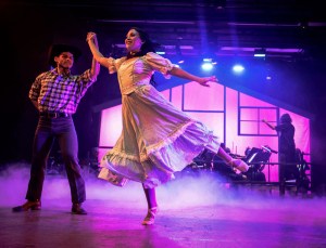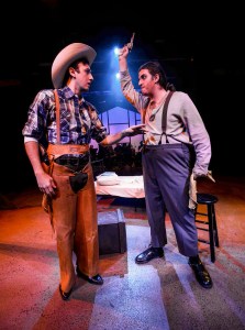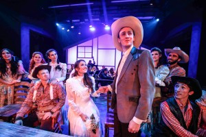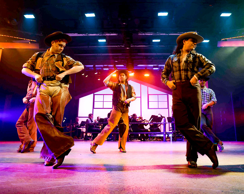 “There’s a reason they call this a classic,” Lorton observed on opening night, and refreshingly, he has stayed true to the tone and the times the show is set in, while still shaking things up with just the right touch—emphasizing a character or plot point here, playing down or delaying some others there, with the end result being the audience receiving a truer, fuller, production than has been seen of late (including your Senior class production from way back when!) Perhaps one of the most superlative things that can be said of the show’s general layout lies in how one scene flows logically and effortlessly one after another, and Lorton’s direction makes perceptive use of this. He and his cast aren’t just ‘performing’ “Oklahoma”—they’re enhancing it! Another way he’s managed this is by opening it up by way of restoring several of the score’s ‘cut’ or seldom heard numbers which afford deeper insight into the characters who sing them. Once again making judicious use of the entire auditorium, Lorton has “Curly” make his initial entrance from the rear of the theater, thus adding drama and excitement right from the get-go, as our Hero launches into the iconic “Oh, What A Beautiful Morning”. In Act Two, the near-epic “Farmer And The Cowman (Should Be Friends)” is also a bubbly way to start things up after the break, led by “Aunt Eller” and Farmer (and local Marshall) “Cord Elam” (played by Derek Isaza) before they’re joined by the rest of the cast for an out-and-out full-on musical extravaganza. Throw in plenty of flashy and frenetic choreography jam packed with some honest-to-goodness high-falutin’ fancy footwork as it escalates into a spirited square-dance with loads of high kicks and pirouettes, and this is easily the blue-ribbon prize-winner of the entire show. Then again, arguably the key anthem for many is the title number, which has been fashioned as another first-class chorale endeavor late in the show–but it sure enough is worth waiting for!