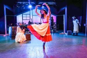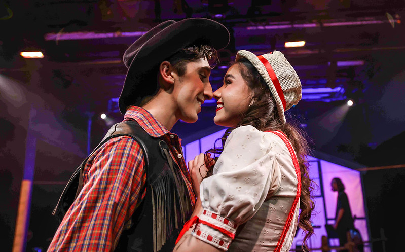 “S’posin’ ‘at he says ‘at yer lips’re like cherries, er roses, er berries? Whut you goin’ to do?! S’posin’ ‘at he says ‘at you’re sweeter ‘n cream–and he’s gotta have cream er die? Whut you goin’ to do when he talks thet way? Spit in his eye?!” Gio Martinez as “Ado Annie” kicks up her heels in One More Productions’ 2023 Staging of Rodgers & Hammerstein’s “Oklahoma”