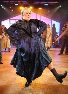 “I’d like to teach you all a little sayin’–and learn these words by heart the way you should: I don’t say I’m no better than anybody else–but I’ll be damned if I ain’t jist as good!” Beth Hansen as “Aunt Eller” kicks up her heels at the start of Act Two In One More Productions’ 2023 Staging of Rodgers & Hammerstein’s “Oklahoma”