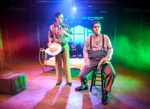 Brimming with a passel of genuinely dazzling dancing, it’s fair to say that in the capable hands of Mesdames Dawson and Lawson and their cast, this production doesn’t merely thrive—it electrifies! This too, is another example of how this particular version surpasses its predecessors by defying expectations. Adding to it is how Ms. Lawson and Ms. Dawson have embedded little bits of vivacious movement into numerous ‘smaller’ numbers which make them ingeniously ‘stand out’ all the more. These incidents may not be so anticipated, but each number benefits immensely from their inclusion. At the close of the first act, the ballet, “Out Of My Dreams”–widely considered the show’s choreographic centerpiece, is a splendid group effort, introduced and liltingly sung by “Laurey” before ‘opening up’ into her imagination and depicting her courtship with “Curly”. Starting off as an elegant ‘pas-de-deux’, before long it turns nightmarish by “Jud’s” threatening encroachment. ‘Starring’ Angela Mattern as ‘Dream Laurey”, Edvan Perez as “Dream Curly” and Reid Harris as “Dream Jud”, they–and all the other dancers involved, have done an astounding job (this could be worth the price of a ticket alone!) At turns, manic, graceful, athletic, and thoroughly amazing—and with more than a few nods to the show’s original, legendary Choreographer, Agnes DeMille–it propels us into intermission in blithe, brilliant and breathless style! The ballet also cleverly follows “Will” and “Annie’s” romantic intrigues too—and they similarly make inspired use of the pair playing these roles throughout. “Annie” is also given several more episodes to demonstrate her considerable talents at “tripping the light fantastique” including her parts in other sizable numbers like “Many A New Day”, “The Farmer And The Cowman” and “All Er Nuthin’”. Our “Will” meanwhile, is quite a dexterous danseur in his own right– leading a boisterous Boot-Scootin’/Tap interlude disguised as a cowboy hoedown in the midst of “Kansas City”, while the chorus show-off their collective terpsichorean prowess with some pristine ‘pull-backs’, in-unison trenches, and a nifty old Vaudevillian maneuver called “Jumping Over The Log” (–consider this one of the show’s high-steppin’ high-water marks early in the on-stage doings.) Even the entr’acte is a fully choreographed foot-stompin; barn-stormin’ bonanza with lots of leaps, rolls, acrobatics, and even a sassy kick-line! (Just observing all that high-octane, seemingly inexhaustible energy on “The Gem’s” stage is bound to leave spectators a little winded—but loving every second of it!)