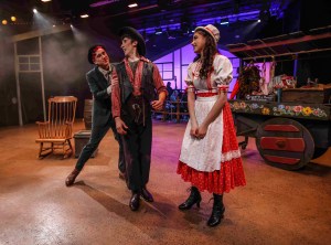 “Twenty minutes ago, I can do what I please–flick my cigar ashes on a rug, dunk with a doughnut, drink from a jug–I’m a happy man! I’m minding my own business like I oughter (ain’t meaning any harm to anyone.) I’m talking to a certain farmer’s daughter—Then I’m looking in the muzzle of a gun!” Peter Crisafulli (Left) as the Peddler “Ali Hakim” tries ‘convincing’ Matthew Rangel (Center) as “Will Parker” to take Gio Martinez (Right) as “Ado Annie” off his hands (before any shots are fired) in One More Productions’ 2023 Staging of Rodgers & Hammerstein’s “Oklahoma”