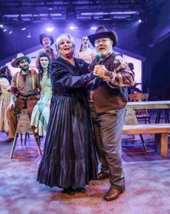“Brand new State gonna treat you great! Gonna give you barley, carrots and pertaters–pasture for the cattle, spinach and termayters! Flowers on the prairie where the June bugs zoom. Plen’y of air and plen’y of room! Plen’y of room to swing a rope–plen’y of heart and plen’y of hope!” Bryan Fraser (Standing Center) as “Curly” and Erika Baldwin (Seater Center) as “Laurey” celebrate with the rest of the cast their favorite territory’s official statehood in One More Productions’ 2023 Staging of Rodgers & Hammerstein’s “Oklahoma”