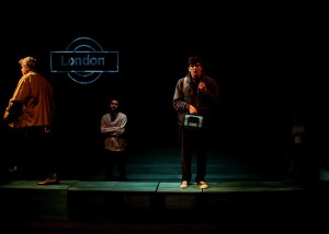 Aaron Lipp as “Christopher Boone” stands desolately on a London train platform in his quest to find his mother somewhere in the big city with passersby Jonathon Lamer and Jared Machado in “The Curious Incident Of The Dog In The Night-Time” at “The Chance Theater” @ “Bette Aitken Theater Arts Center” in Anaheim, CA.