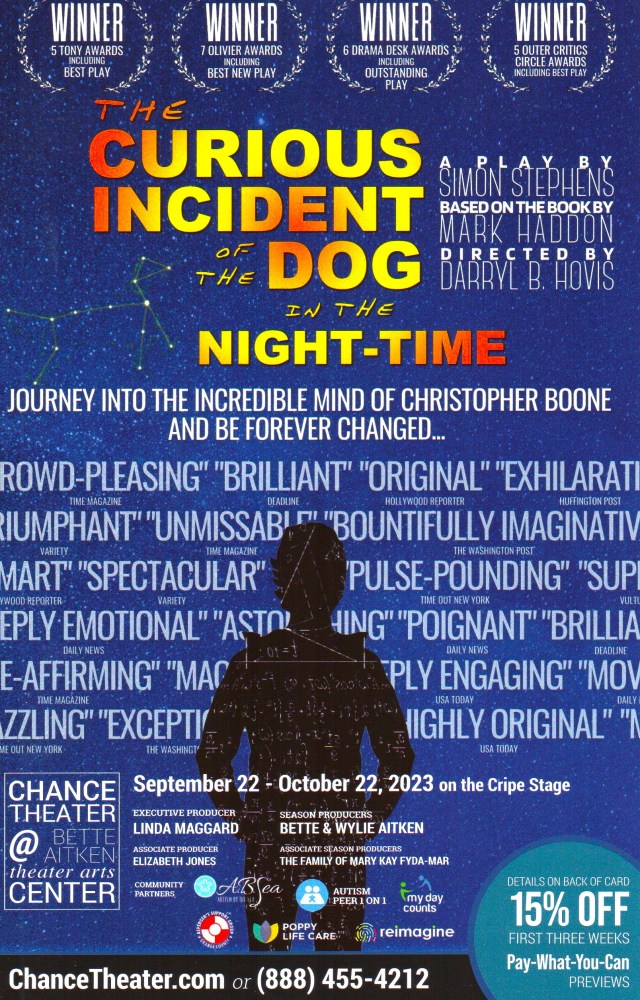 “The Chance Theater” at “The Bette Aitken Theater Arts Center” in Anaheim CA. Presents “The Curious Incident Of The Dog In The Night-Time” September 30th —October 22nd, 2023 http://www.ChanceTheater.com