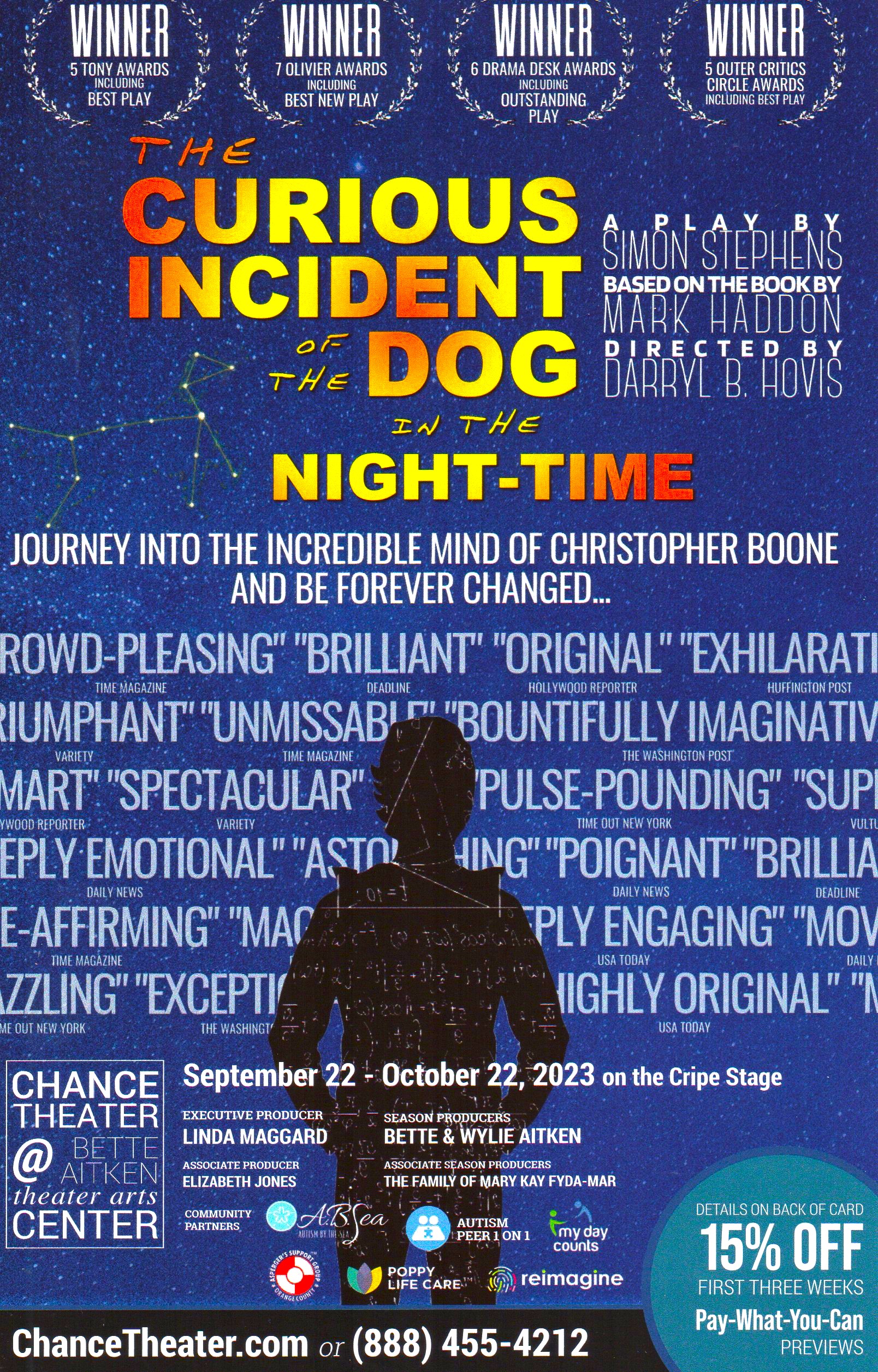 “The Chance Theater” at “The Bette Aitken Theater Arts Center” in Anaheim CA. Presents “The Curious Incident Of The Dog In The Night-Time” September 30th —October 22nd, 2023 http://www.ChanceTheater.com