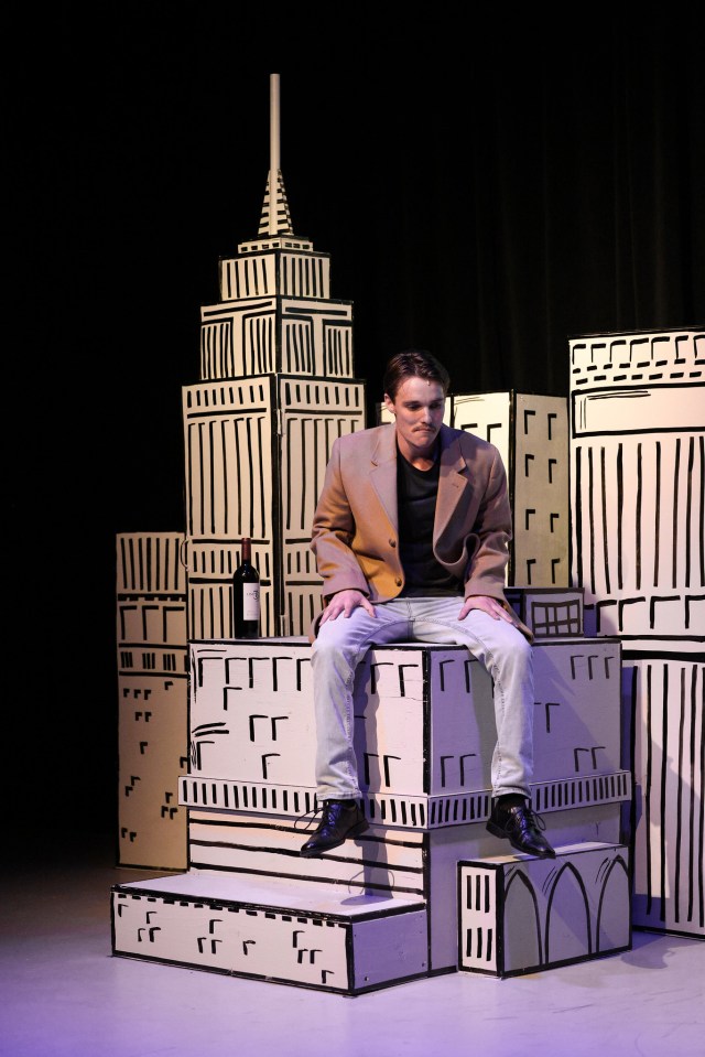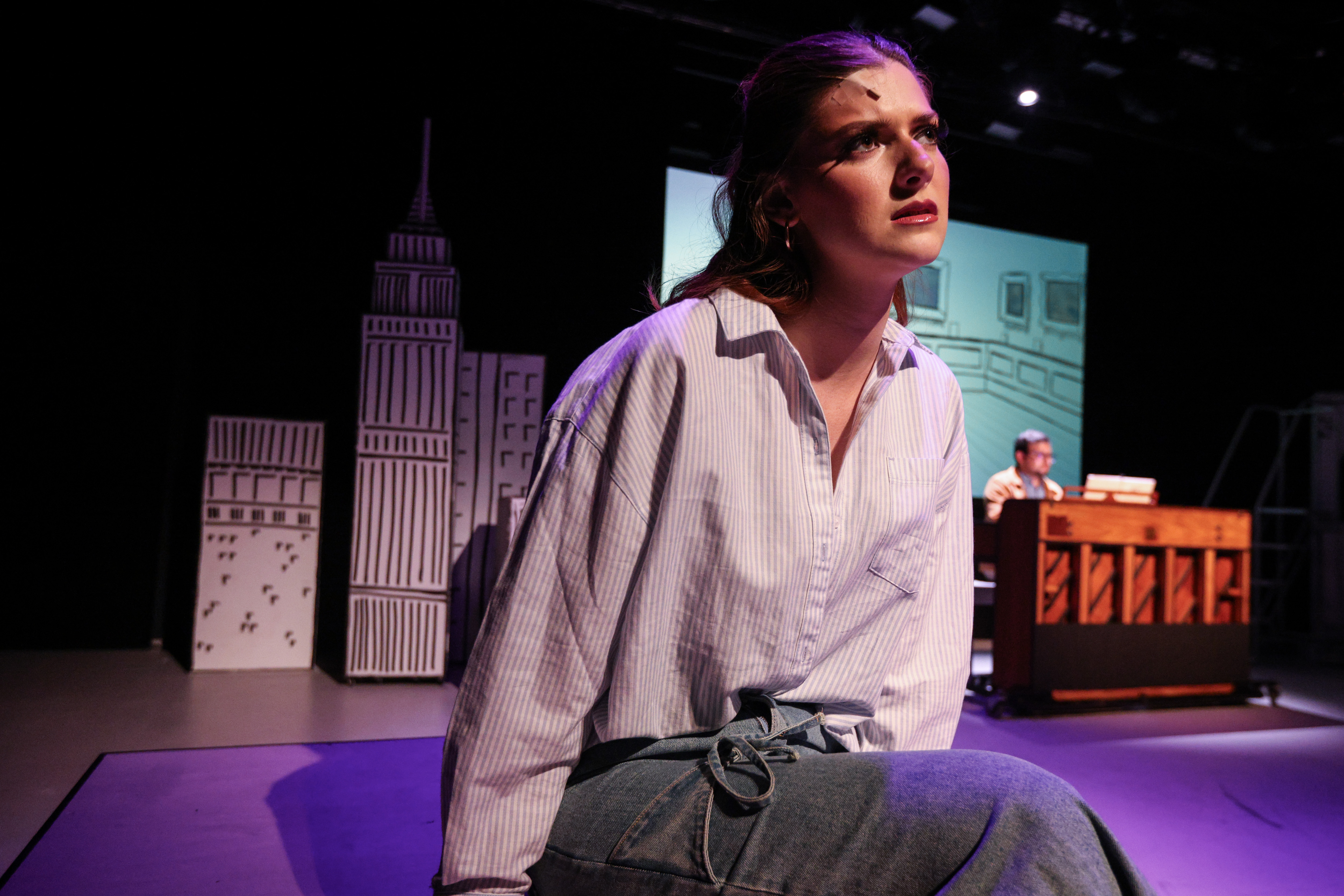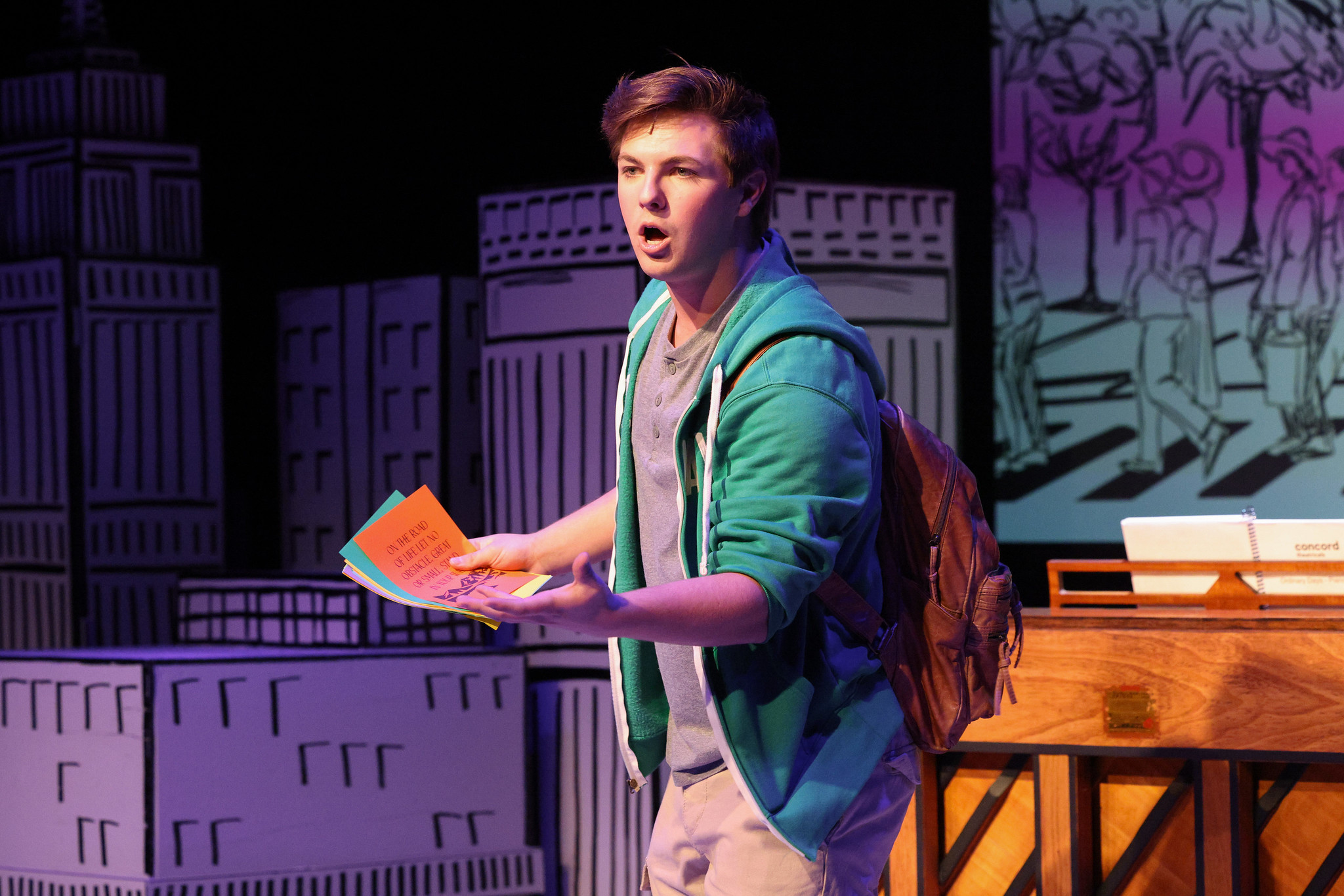 The cast is comprised of a band of newer talents to “The Gem” stage (think of them as “One More Production’s “New Class”, as we’re certain to be hearing more from them in the upcoming seasons!) The four actors and a sole pianist couldn’t be better–each, to-a-one, deliver performances that are heartfelt and authentic and…well, musical. In addition, everyone brings their character to life with nuance, and an understanding of their triumphs and struggles making their interactions feel genuine and impactful. We could actually KNOW (and maybe HAVE) these characters, and the sublime chemistry between the actors playing them is deep, refreshing and palpable. The jubilant opening, fittingly called “One By One By One”, has all four entering and ‘singing’ a basic introduction of who they are while also demonstrating their really splendid vocal strengths—especially as it pertains to rendering some witty expositionary stanzas. Shortly after, we meet “Warren”—a wannabe Artist who just longs to be noticed—by anyone; to that end, he spends his time throwing colorful large print flyers (featuring simple but wise, homespun little axioms like “The Worst Mistake Is Not Making Any’ or “Never Let the Tallest Building Obscure The View Of Your Dreams”,) from the uppermost floors of local high-rise buildings to the streets below.