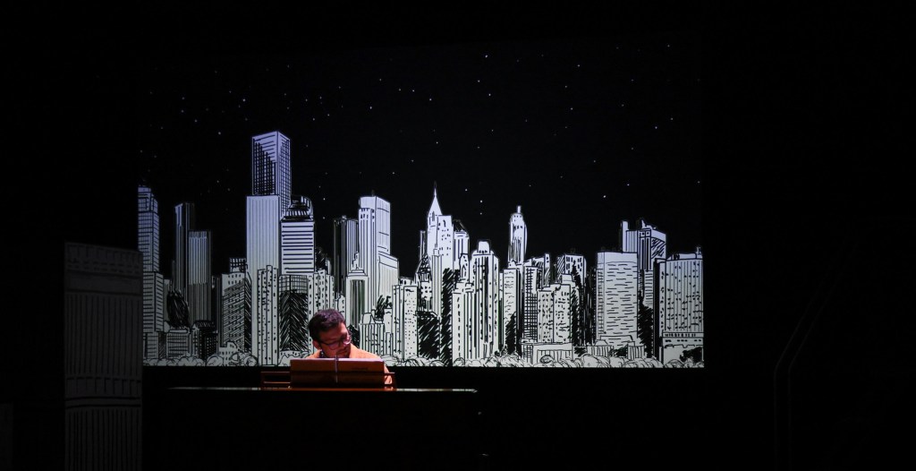 Looking at this production from a ‘technical’ standpoint, when it comes to the Set Design, this may very well be the MOST unique of any show to appear before “The Gem’s” footlights. Victor Crisafulli’s innovative Set Design is minimalist yet wholly unique, allowing the focus to remain on the characters and their stories while helping to “set the scene” (even the piano is mobile!) These “set pieces” include a large model of the Brooklyn Bridge that stands rear-stage right. But its way more than that–Crisafulli’s designs also incorporate the use of innovative “props” (case-in-point: a cabinet that looks like the Empire State Building—and then serves that function as a cityscape set piece off to the rear of the stage when not in use.) All of these are enhanced by Jeremy Huff’s comparably impressive Lighting Designs. The ‘Cosmopolitan’ lighting he concocts to suggest various “Big Apple” landmarks: the Subway, Times Square, a Luxury Highrise on Central Park West, etc. Together and alone, each couldn’t suit the atmosphere being depicted better. Consider too how, adding to this shrewd way to indicate place and time still more, are the rear-scrim projections from Projection Graphic Designer Julia Johnston. Much of her selections cleverly recall sketches and cartoons found in issues of “The New Yorker” magazine with wit and comedic insight.