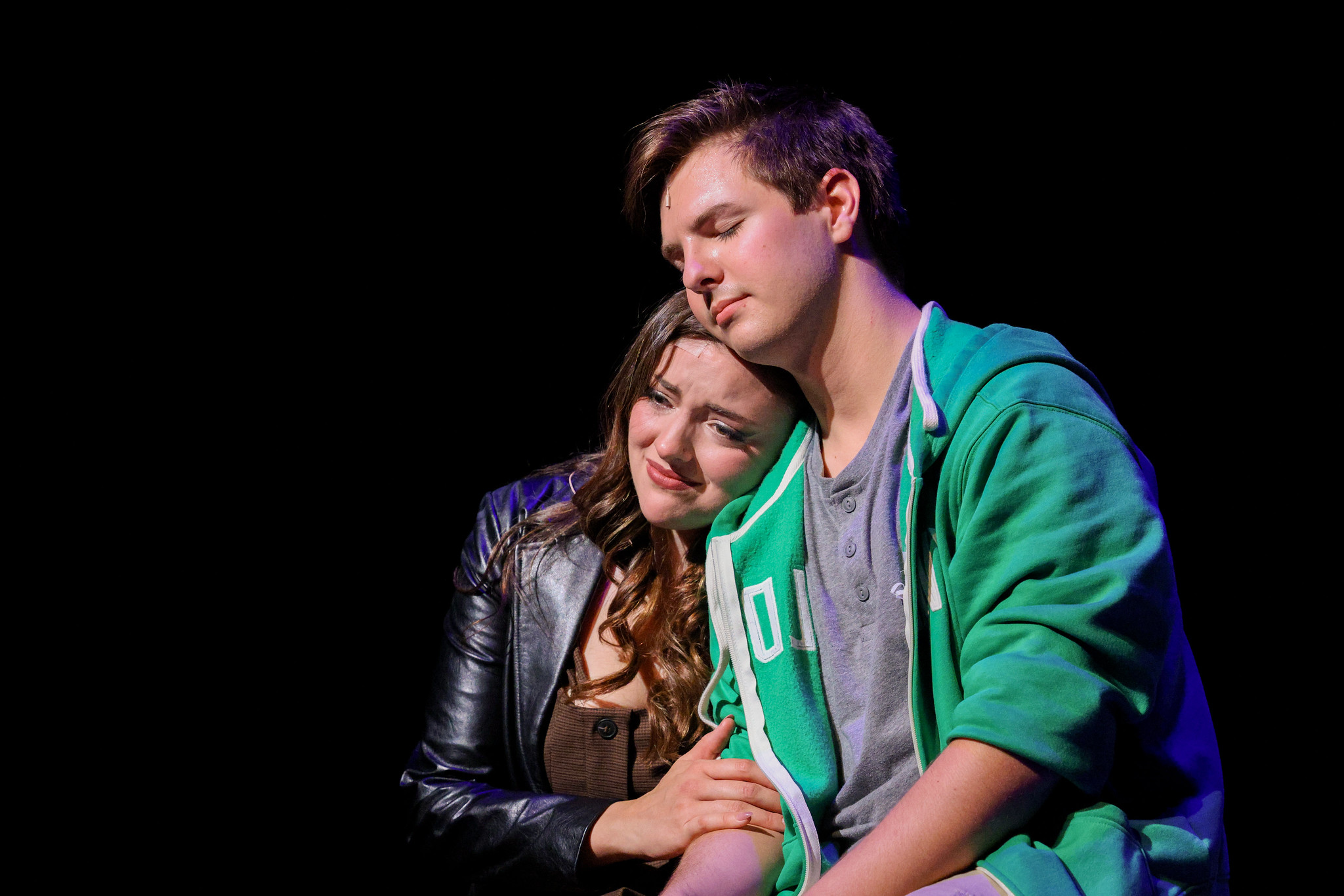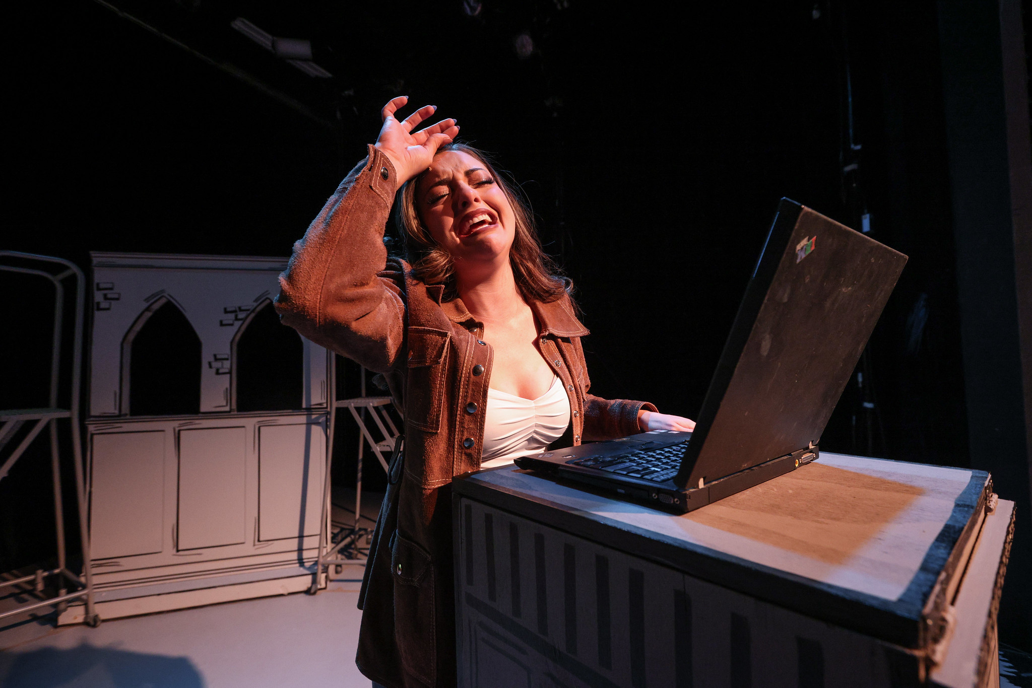 Sean Hawkins absolutely shines as “Warren”—the resident ‘slacker” of the group—playing him as that friend we all have who’s just ‘this side’ of goofy, but thoroughly likeable. Gifted with a laudable voice and affable stage presence, his “Warren” is a hopeful artist and chronic, acute optimist who possesses the gift of seeing potential and positivity in every corner. Joining him–and in many ways, his character counterpoint (in light of her almost obsessive success-driven fixation on accomplishment,) Sasha Baker is “Deb”. An easily agitated Graduate Student whom we learn is putting the finishing touches on her big thesis regarding the celebrated Authoress Virginia Woolf, until she discovers that her notes are not in the bag where she “swears she kept them.” (Cue the emotional melt-down!) In a side-splitting hyper-agitated “sung-soliloquy” called “Dear Professor Thompson” she imagines contacting her Supervising Instructor to plead for an extension, (knowing full well that this is a request he will never grant.) Later, opposite Mr. Hawkins, “Deb” and “Warren” share a stand-out duet, “What’s Your Big Picture” which, both exceptional and pithy, is one of the oeuvre’s major standouts. (“Big is a relative thing” Warren advises Deb in an attempt to soothe her rumpled nerves.) As a team, Ms. Baker and Mr. Hawkins conjure some dynamic chemistry, thanks to their contrasting stage-personalities, thus giving rise to a much appreciated abundance of brightness and levity amidst the ‘deeper’ and more ‘weighty’ scenes.