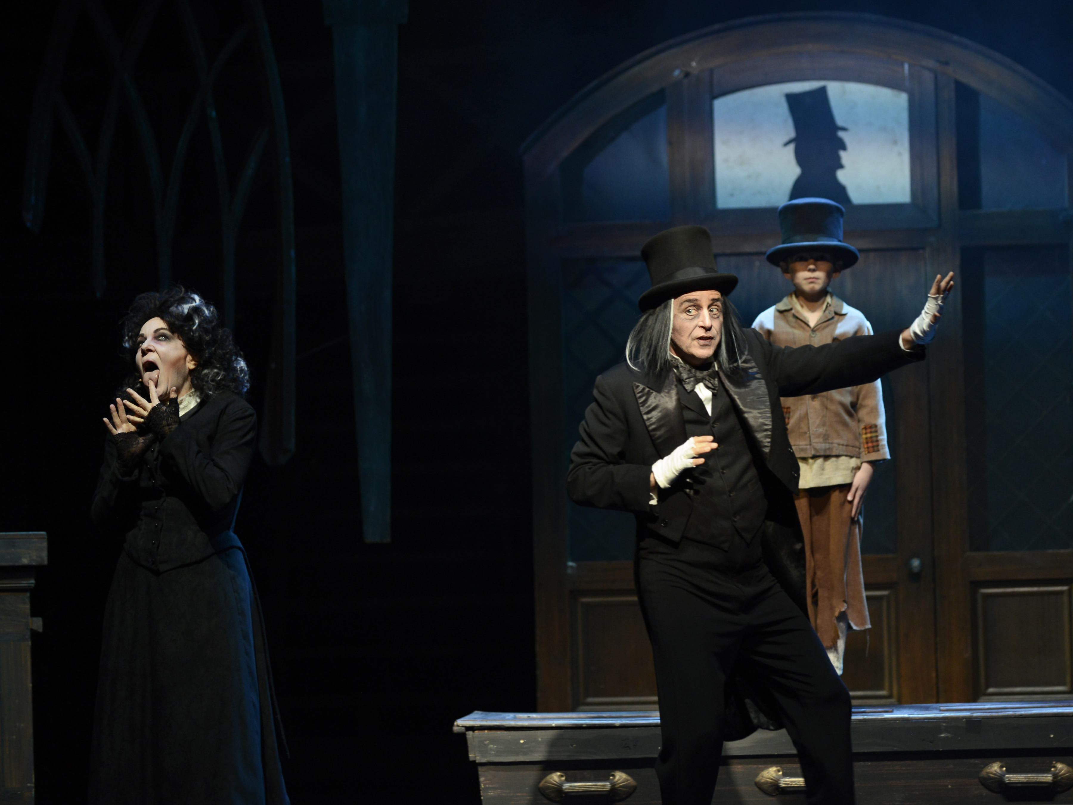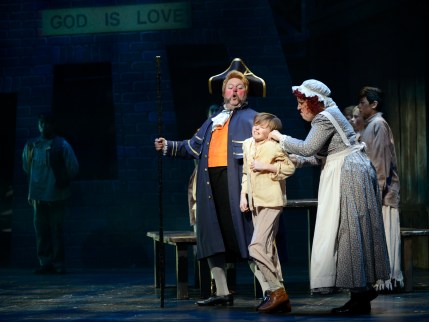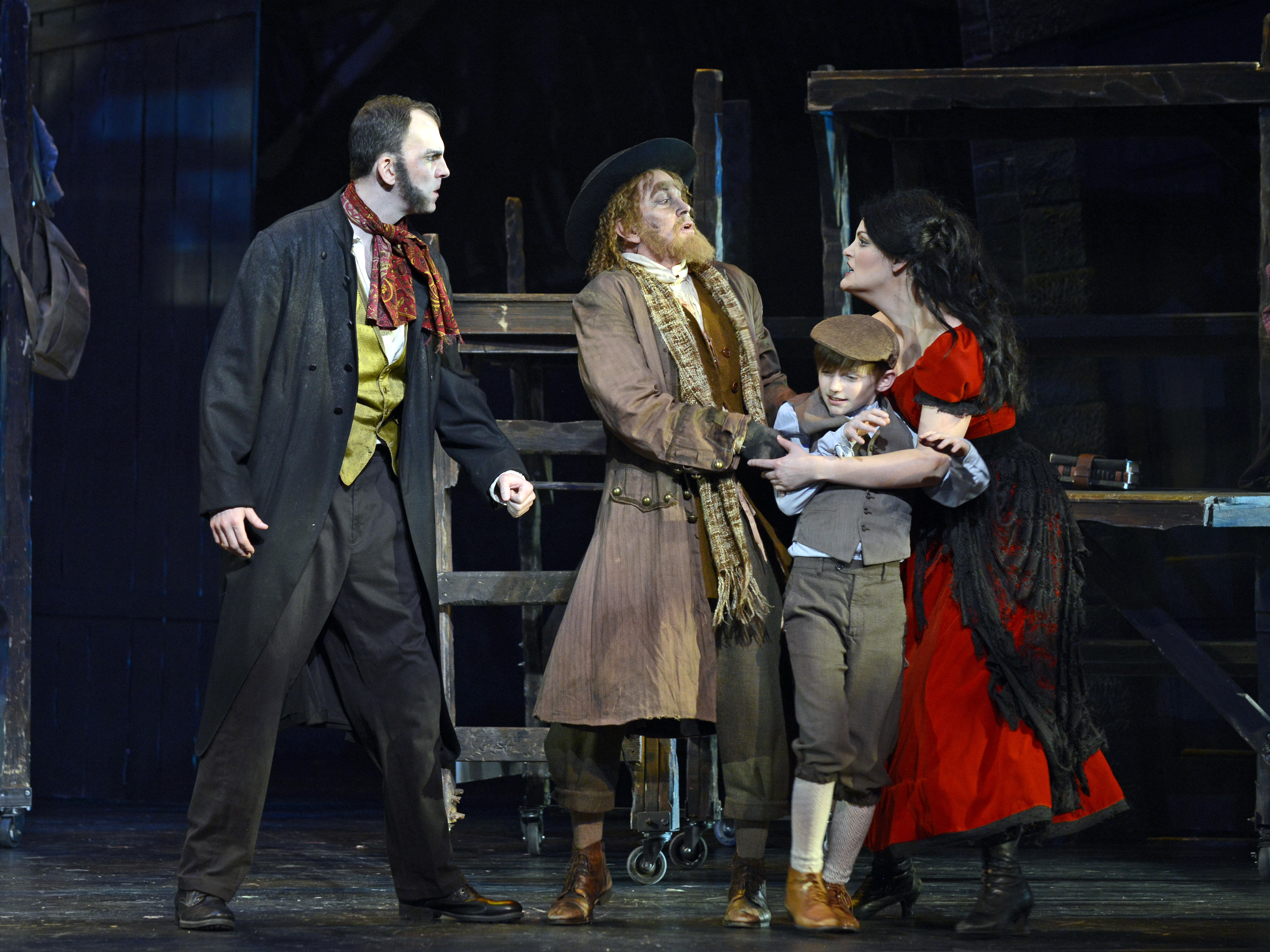 “Lord ‘elp me, I wish I’d been struck dead in the street before I lent a hand in bringing him here! After today, ‘e’s a thief—and a liar! And all that’s BAD from this day forth! Ain’t that enough for yer without beating him to death?!” Cayman Ilika as “Nancy” confronts Kenny Landmon as “Bill Sikes” and Davis Gaines as “Fagin” while trying to protect Travis Burnett as “Oliver Twist” in “Musical Theatre West’s” production of “Oliver!