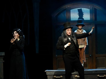 “We don’t harbor thoughts macabre—there’s no need to frown; in the end we’ll either burn you up or nail you down!” Cynthia Ferrer as “Mrs. Sowerberry” and Kevin McMahon as “Mr. Sowerberry” are undertakers who exult the joys of their chosen profession in “Musical Theatre West’s” production of “Oliver!”
