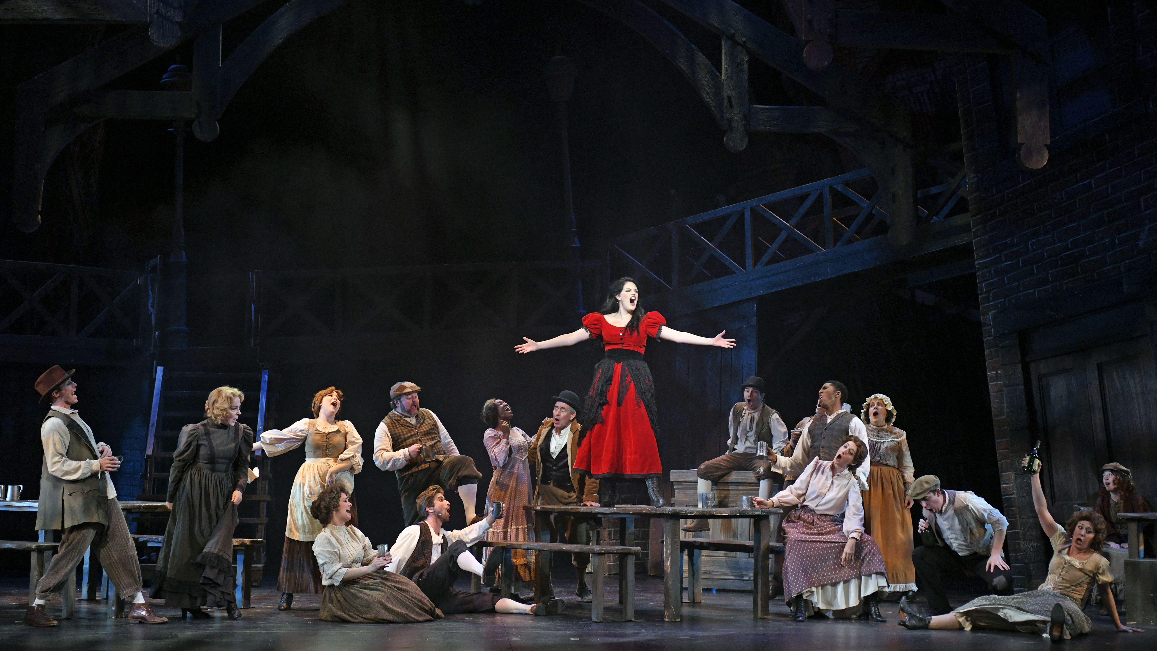 “Pretty little Sally goes walking down the alley, displays her pretty ankles to all of the men. They could see her garters–but not for free-and-gratis–an inch or two, and then she knows when to say when!” Cayman Ilika as “Nancy” leads the ensemble in a witty little ‘Tavern Lieder’ in “Musical Theatre West’s” production of “Oliver!”